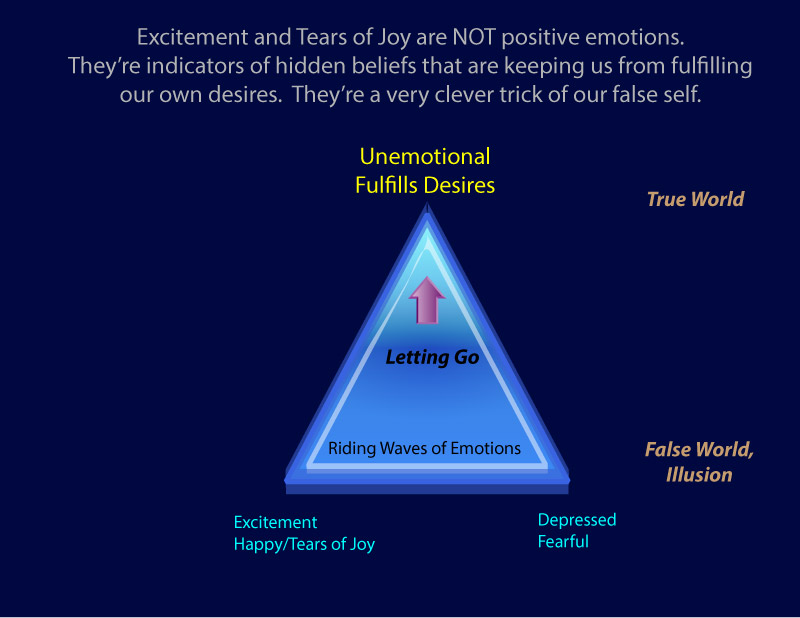 This gets confusing in relationships. Often, we’re listening to another; and we feel emotion when we take their false thought or belief into our body-mind. If we don’t let their belief go, it sits there accumulating power; and it keeps us from getting what we want in life. We don’t realize we have this belief; and often it’s revealed in excitement or tears of joy. But we don’t catch the opportunity to let it go because society tells us these are positive emotions.