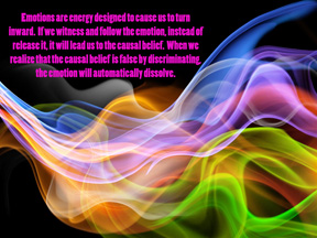 Emotions are designed to pull us inward so we’ll examine our minds and let go of problematic beliefs (causes).  Ideally, when we feel emotion, we’d remove our attention from what is outside and turn inside.  We’d witness or follow the emotion to the causal belief.  We’d let the causal belief go, and the emotion would go too.