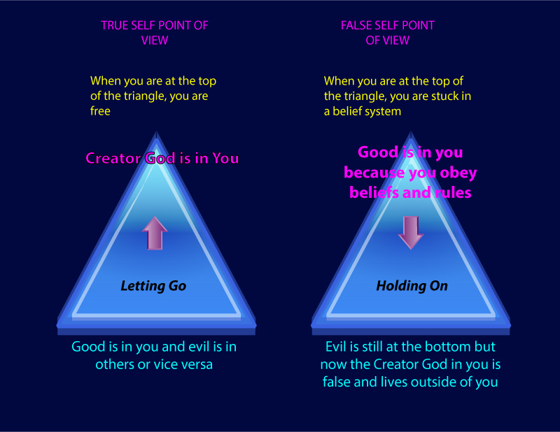 Any concept in the illusion has two sides; the True Self doesn’t have an opposite. The New Age and self-help movements copied a very old trick invented by religion. They take something from the bottom of the triangle and move it to the top (see above). Now the True Self must move to the bottom. What used to be true is now dual and false.