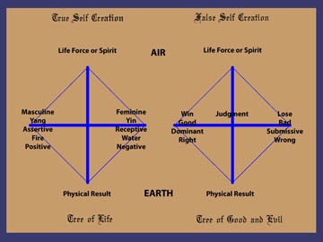 Let’s say that you want to build a house. The True Self enters the cross of creation at the top. The bottom is the result or effect. Just like our physical arms do physical creation work, the arms of the cross do the mental creation work. We use words (or images) as symbols for the mental creation process. I find it easiest to use male and female or fire and water words. Maybe our first thought is that we want the process to be fast (fire) and smooth (water). We want our house to be sturdy (masculine) and relaxing (feminine). If we could stay in first cause, the house would manifest with ease.