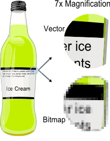 The above photo demonstrates the difference between a raster and a vector image. The raster image (bitmap) is made up of dots or pixels. You can make a raster image smaller without losing quality, but you can’t make it bigger. The number of dots in the raster image are finite.
